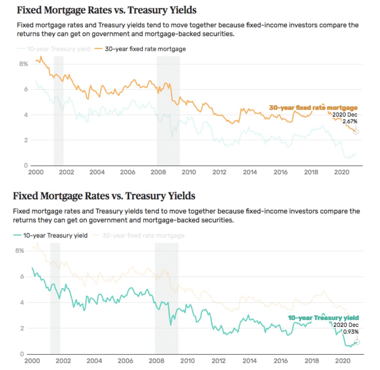 Another is the 10-year Treasury yield. The Treasury yield is the interest rate the government pays to borrow money over different periods. Back in March, when the first pandemic concerns hit the country, the 10-year Treasury yield reached an all-time low of 0.54 percent. Just this month, the yield mark tipped over the one percent line at 1.04 percent – the highest since March 2020. The Treasury rates tend to influence the movement of rates or act as a benchmark for mortgage rates. Therefore, if the 10-year Treasury yield continues to increase, mortgage rates will bump up. See the patterns displayed in the following graphic:
